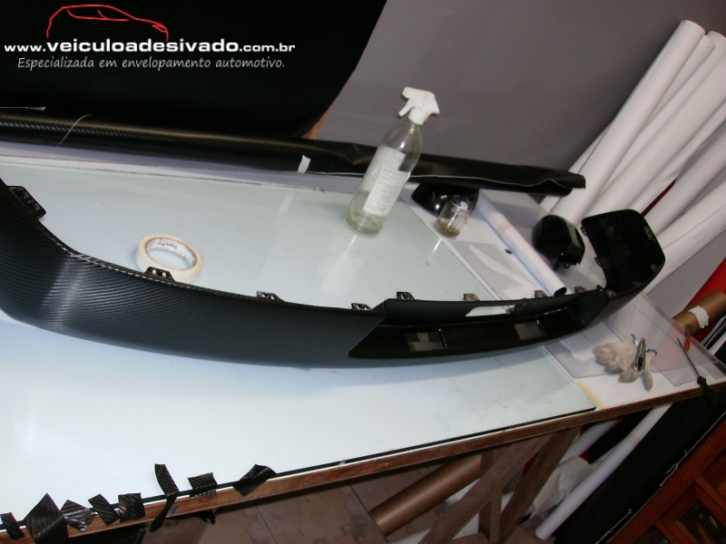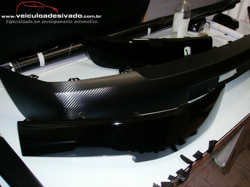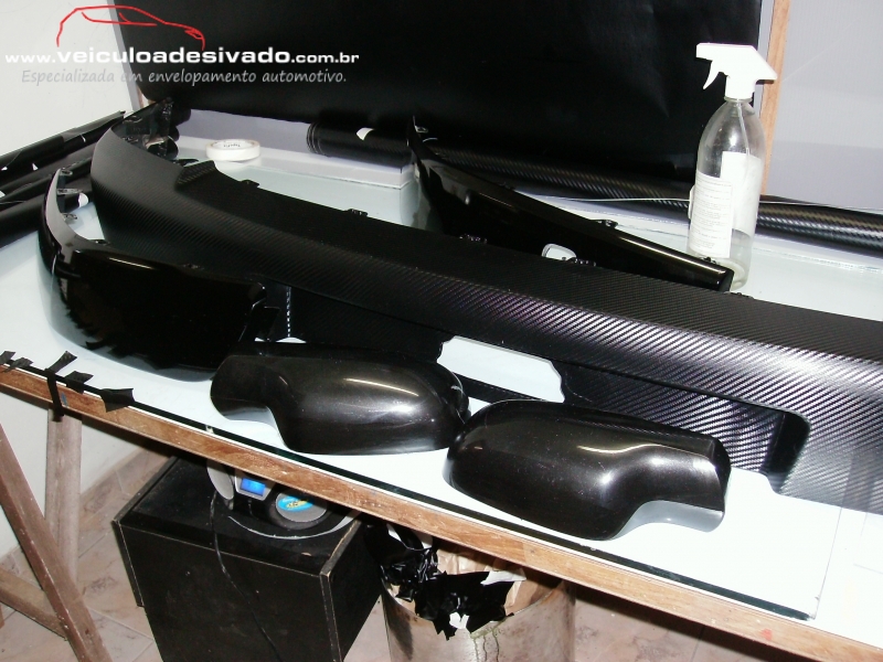 Envelopamento total em vinil  adesivo fibra de carbono, aonde é desmontado algumas partes do veículo para melhor acabamento da película.